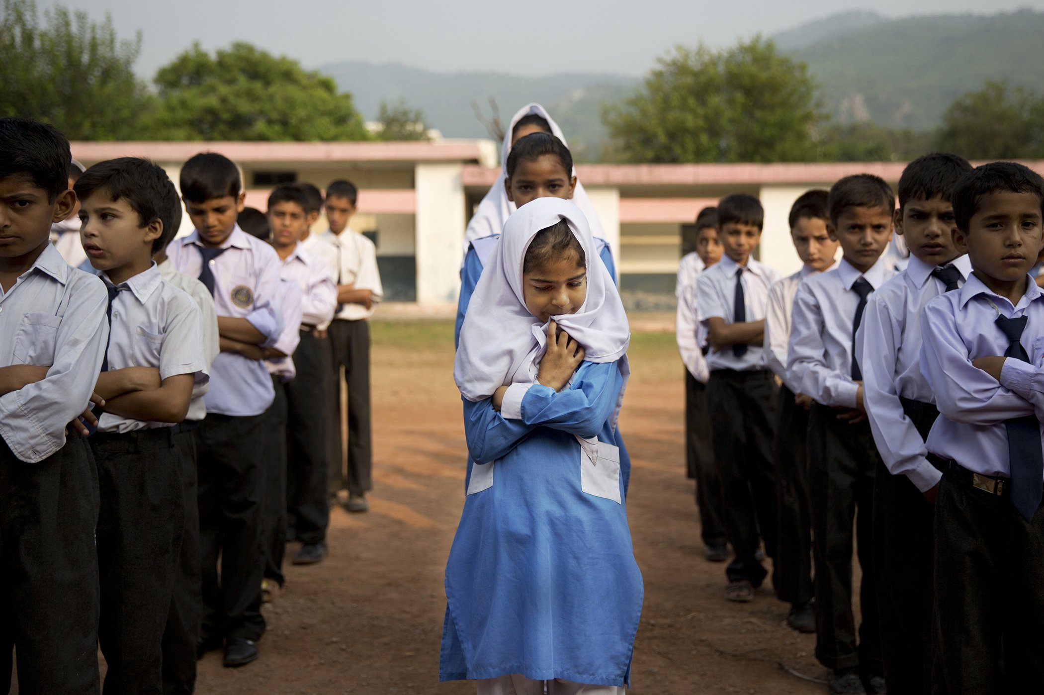 Mädchen stellen sich im Oktober 2013 in einer Schule in Islamabad für die Nationalhymne auf. In den von Taliban kontrollierten Gebieten Pakistans wurden Hunderte Schulen zerstört, um Mädchen den Zugang zur Bildung zu verwehren.