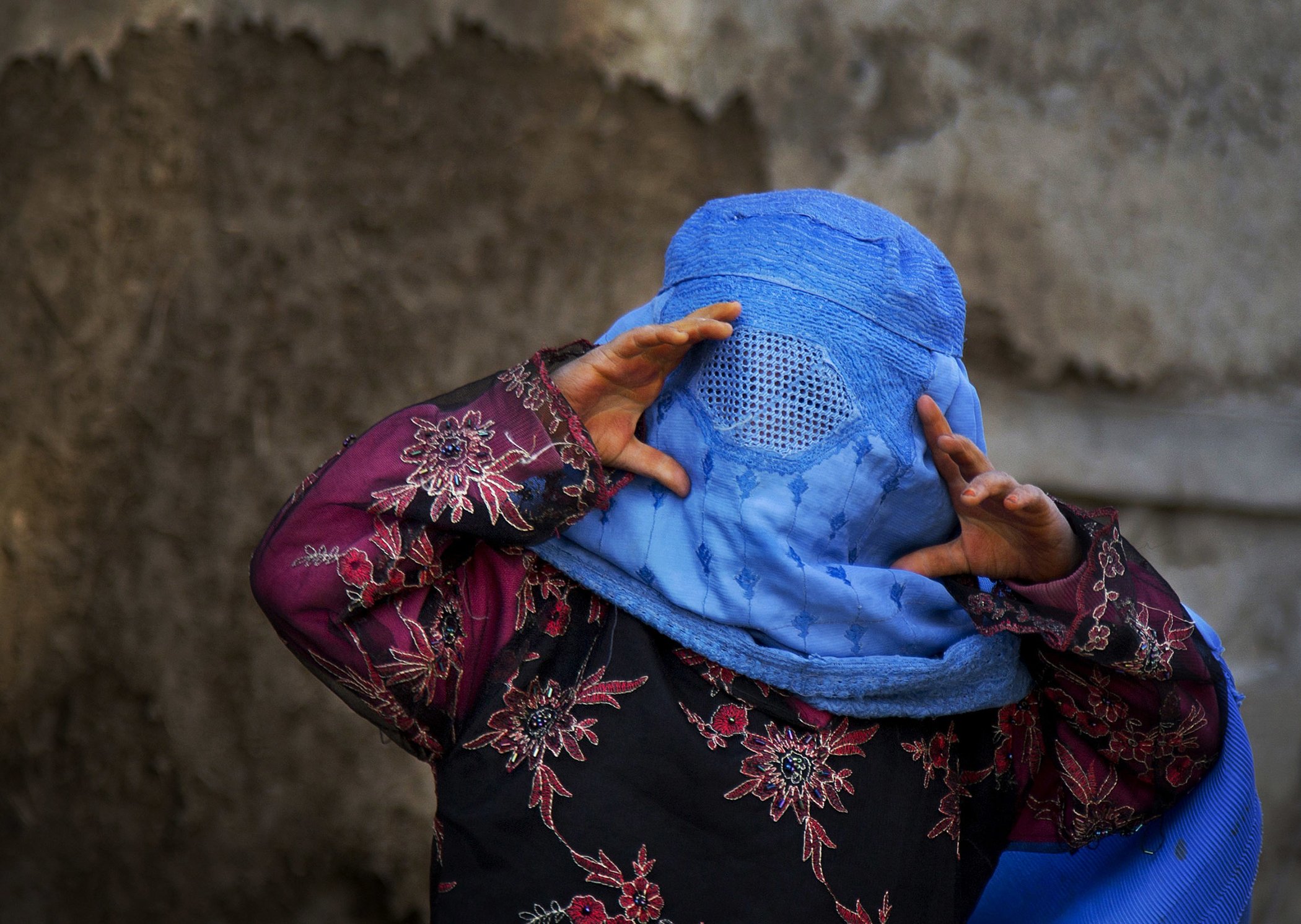 In this April 7, 2013, file photo, an Afghan girl tries to peer through the holes of her burqa as she plays with other children in the old town of Kabul, Afghanistan.