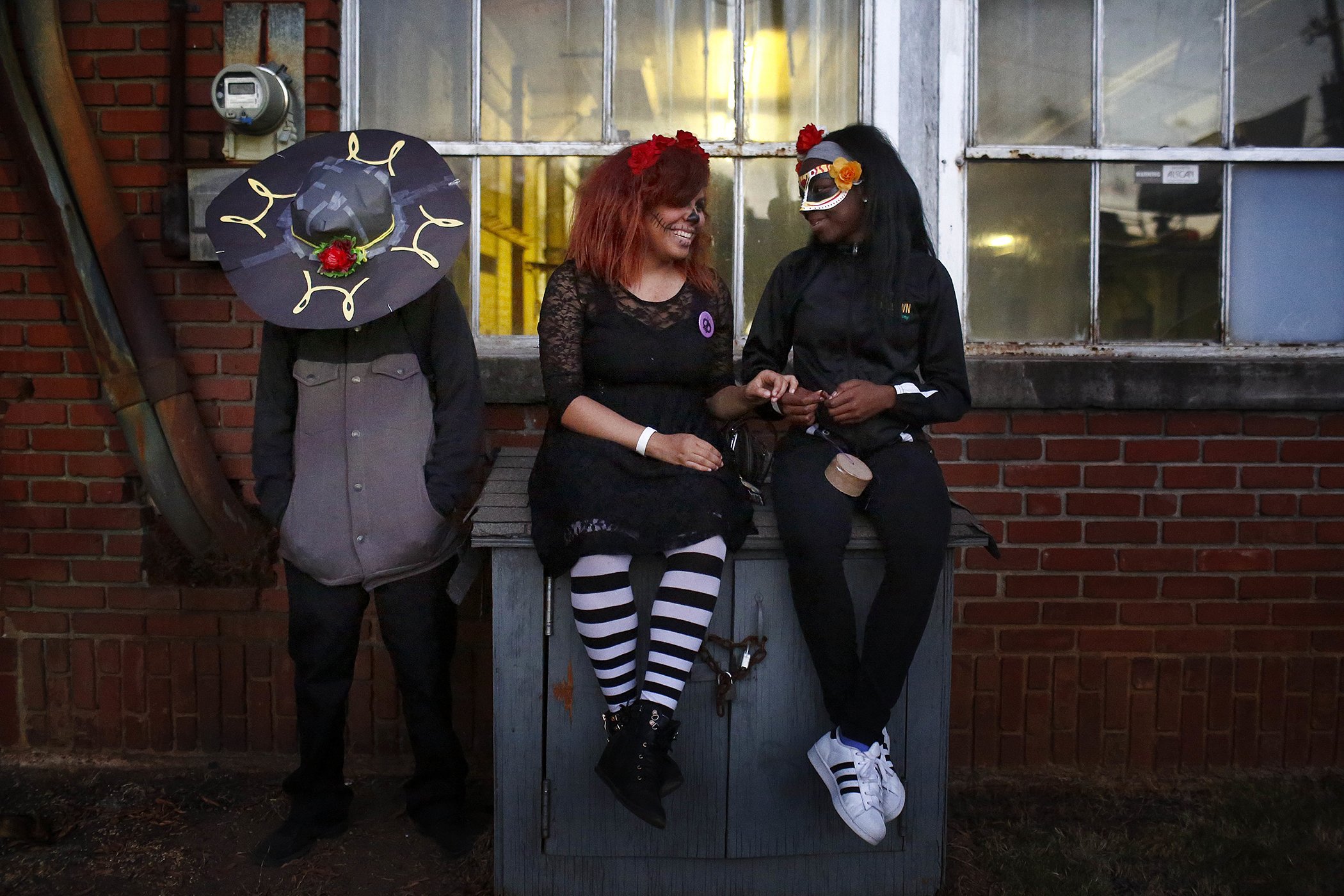 In this Nov. 2, 2016, file photo, Luis Varela, 17, left, Gabby Reynolds, 18, and Mariah Perry, 15, all of Birmingham, Ala., enjoy the festivities and music during a Day of the Dead celebration, in Birmingham, Ala.