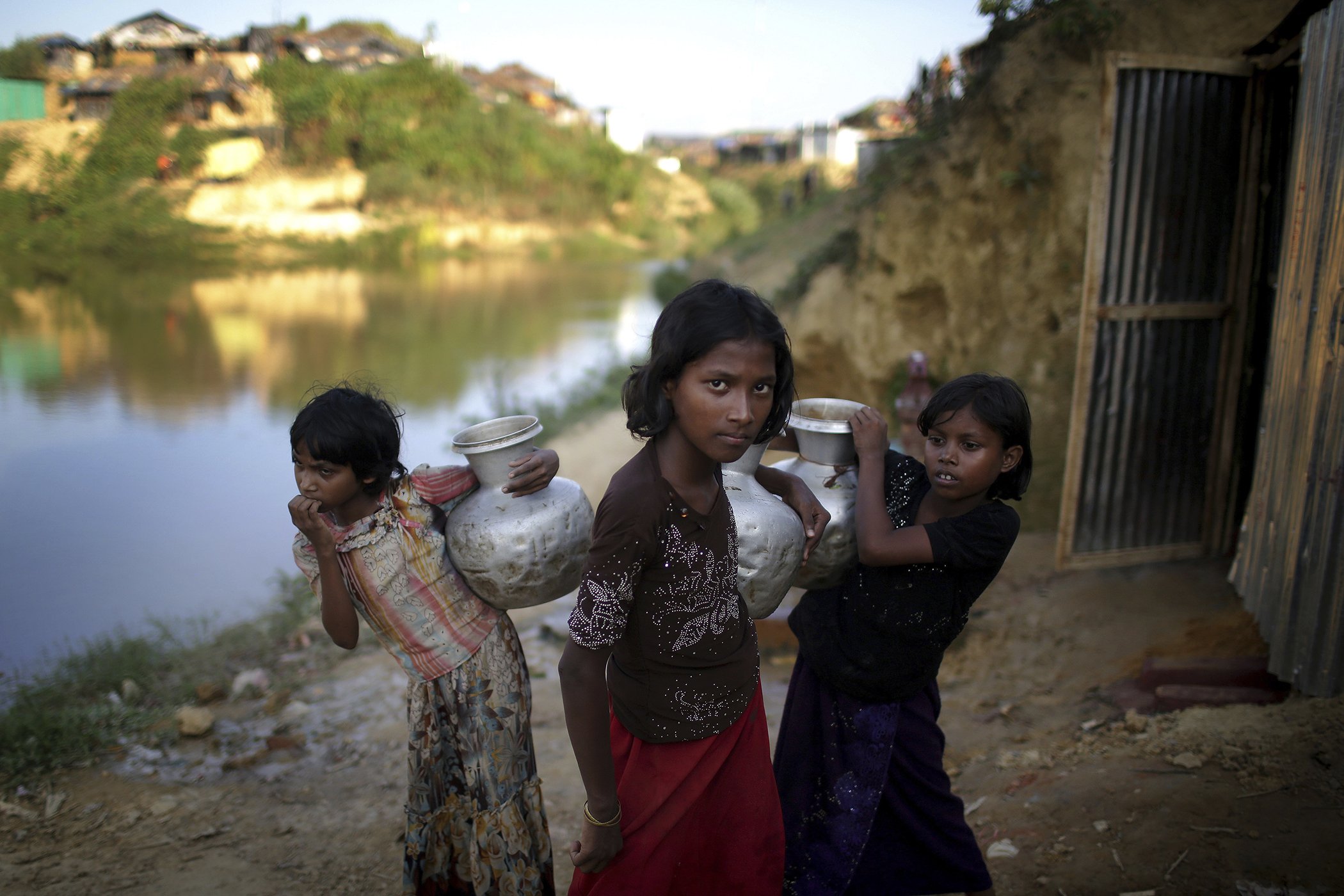 In this Sunday, Nov. 19, 2017, file photo, Rohingya Muslim girls carry water pots in Kutupalong refugee camp in Bangladesh.