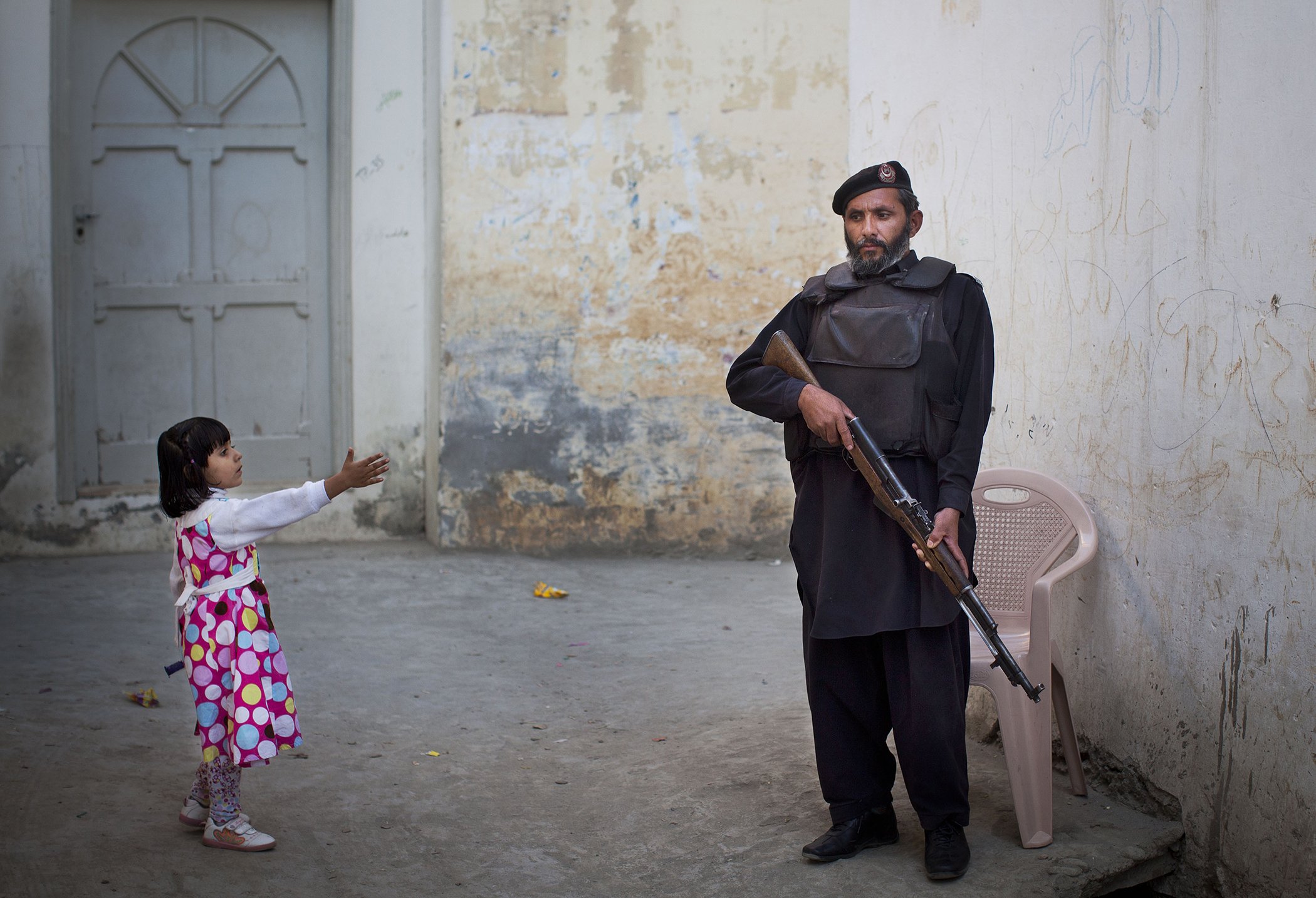 In this Wednesday, Nov. 15, 2012 file photo, a young girl in her colorful dress reaches out to greet a Pakistani policeman securing the road outside Kainat Riaz's home in Mingora, Swat Valley, Pakistan.