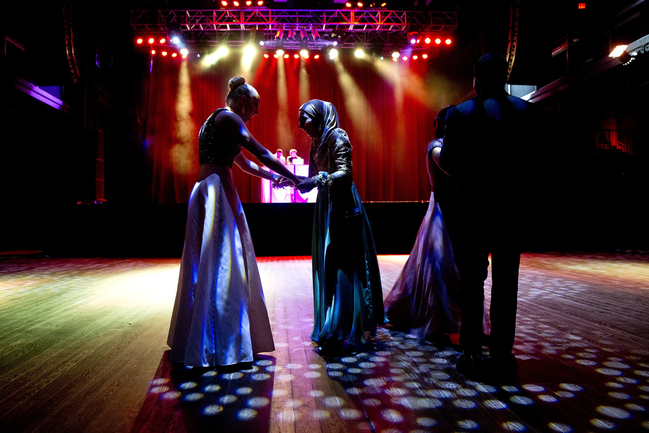 In this May 13, 2016, file photo, Samantha Bischoff, left, compliments Hannah Shraim on her prom dress during Northwest High School's senior prom at the Fillmore Theater in Silver Spring, Md. Senior class president and an observant Muslim, Shraim prays five times a day and hopes to become an advocate for Muslims in the United States.