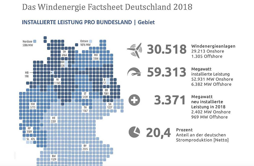 Auch in Deutschland verzeichnet die Windenergie einen steigenden Anteil an der landesweiten Stromversorgung. Laut dem “Bundesverband Windenergie“ (BWE) deckte sie 2018 im 20,4 Prozent der Stromerzeugung im Bundesdurchschnitt.