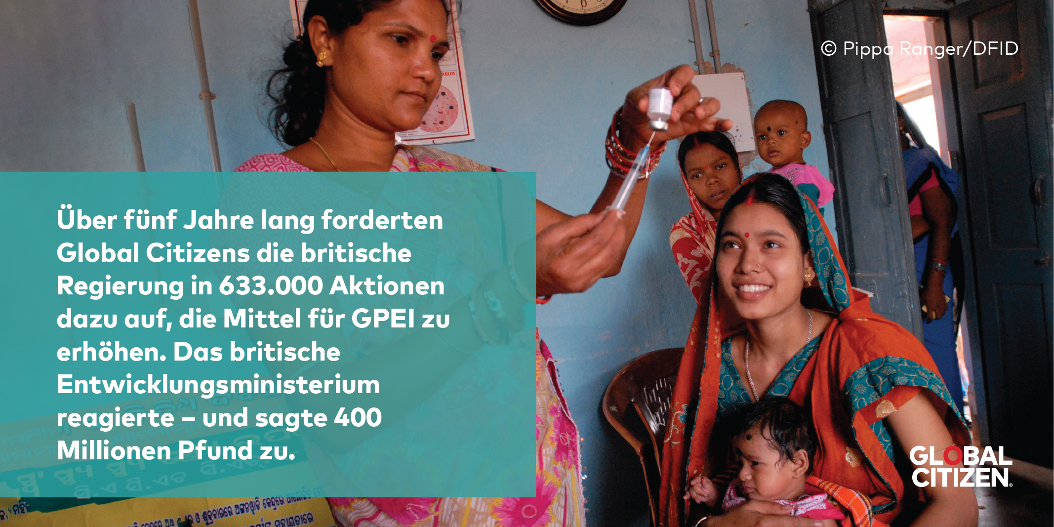 Das Konzert war ein voller Erfolg: 118 Millionen US-Dollar wurden zusätzlich zugesagt. Die Weltgesundheitsorganisation (WHO) sah darin den Wendepunkt im Kampf für die endgültige Ausrottung von Polio. Im Anschluss daran haben wir weitergemacht – vor allem in Großbritannien. Zwischen 2012 und 2013 sind Global Citizens 152.000 Mal aktiv geworden – mit dem Ziel, die britische Regierung zur Aufstockung der Mittel für GPEI zu bewegen. Auch das war von Erfolg gekrönt: Im April 2013 sagte das britische Entwicklungsministerium (DfID) 300 Millionen Pfund für die kommenden sechs Jahre zu.