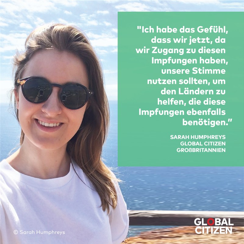 "Ich denke, dass es wirklich wichtig ist, sich bei Global Citizen zu engagieren. Der Aufwand ist gering, aber die wenigen Minuten, die es einen kostet, sich in ein Thema einzulesen und dann aktiv zu werden, können für Menschen in Not so viel bewirken", erklärt Sarah. "Ich denke, dass dieses Engagement wirklich wichtig ist, denn wenn die Leute das nicht machen würden, hätten wir nicht die Bühne, die wir jetzt haben."