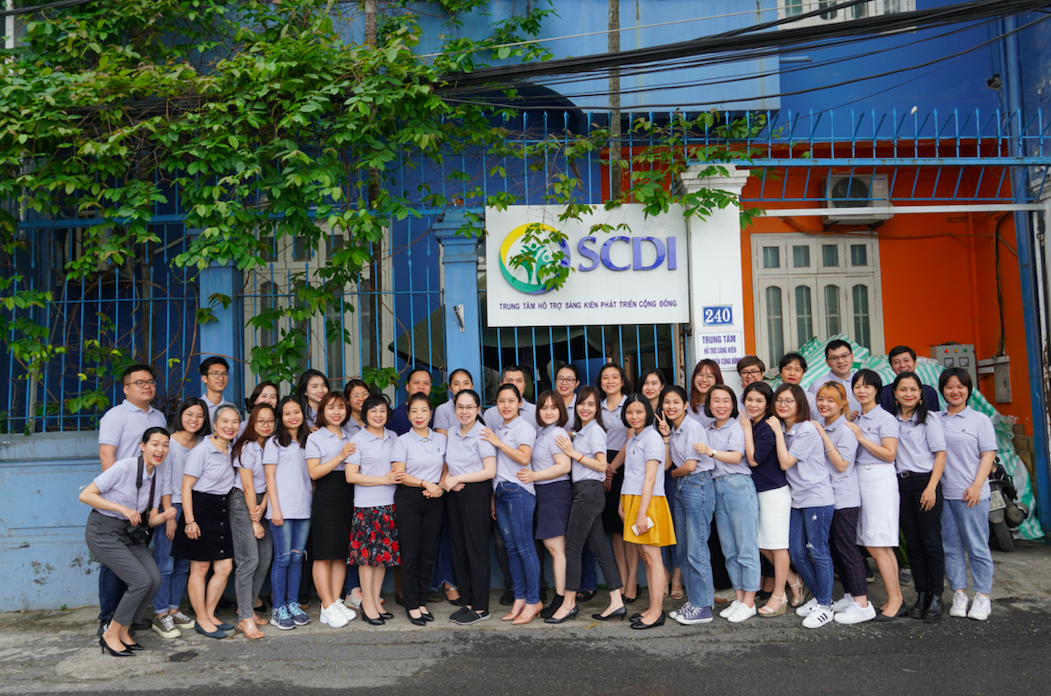 SCDI-Mitrgründerin Oanh und ihre Mitarbeiter*innen vor dem Büro der Organisation in Hanoi, Vietnam.