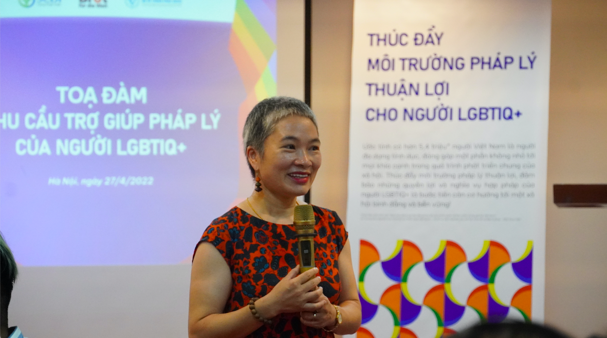 Oanh bei der Eröffnung einer Veranstaltung, die SCDI gemeinsam mit Rechtshilfestellen organisiert hat. Es geht um Rechtsberatung und juristische Unterstützung für LGBTQI+ Menschen.