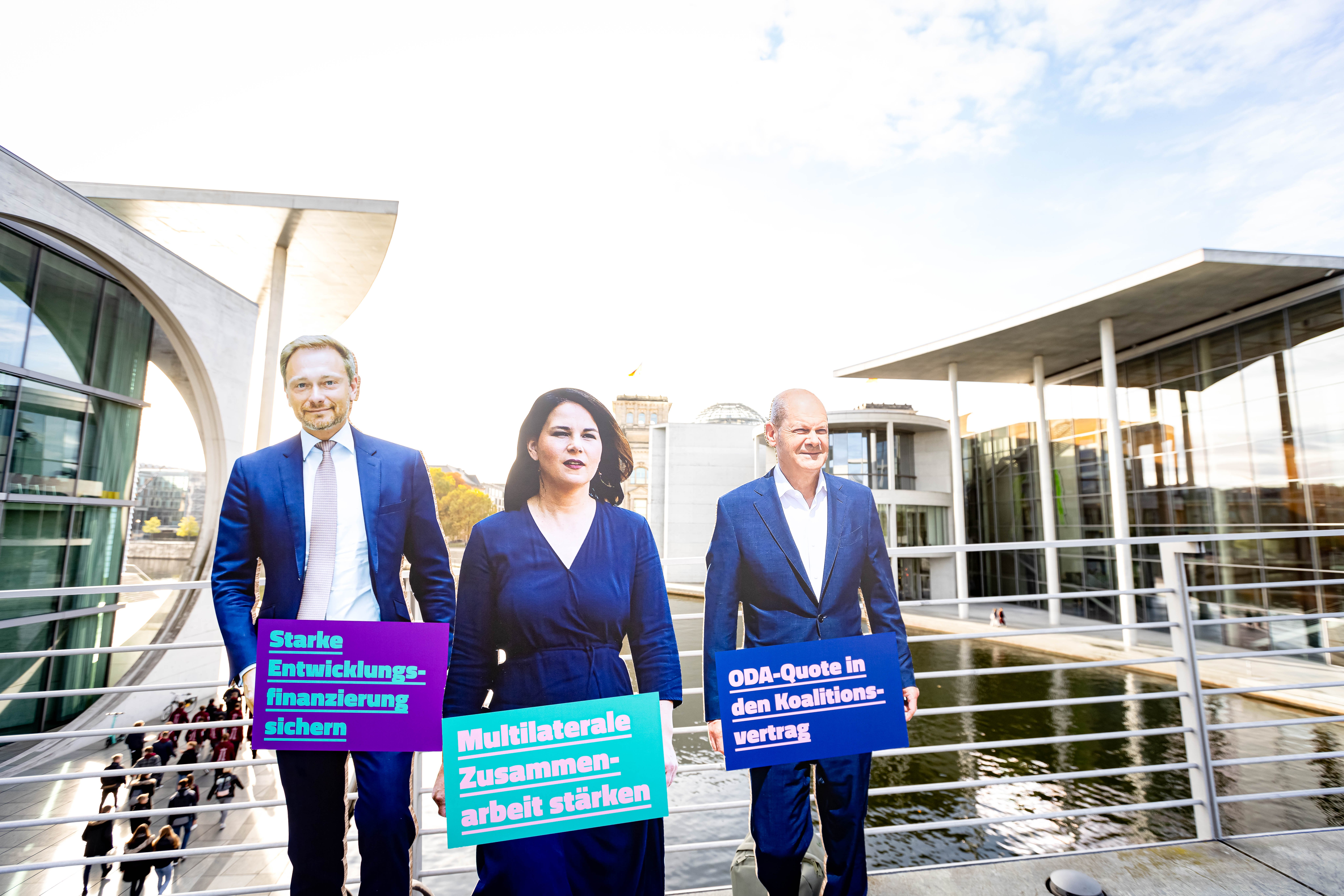 Berlin, 27. Oktober 2021. Anlässlich der heutigen Koalitionsverhandlungen haben 13 Entwicklungsorganisationen die Verhandler*innen mit einer öffentlichen Protestaktion zu mehr Engagement in der Entwicklungszusammenarbeit und humanitären Hilfe aufgefordert.