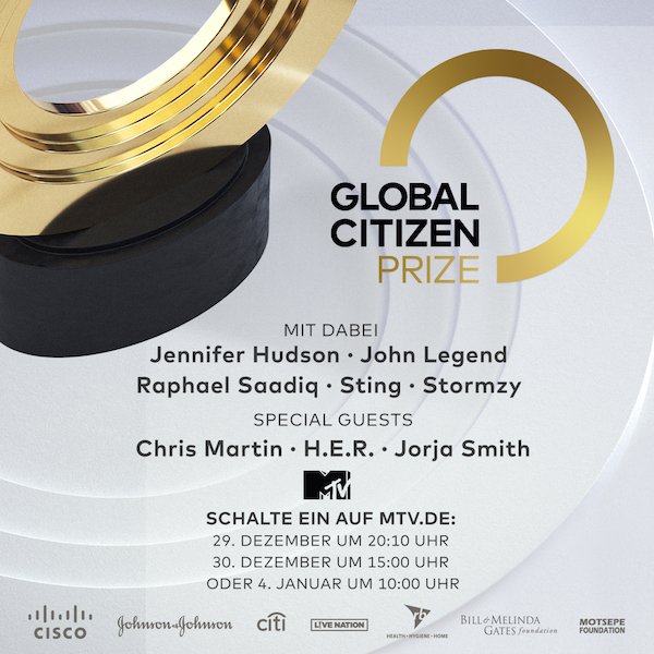 Zu den Partnern des Global Citizen Prize gehören Comcast NBCUniversal, MSNBC, Cisco, Johnson & Johnson, Citi, Live Nation, Reckitt Benckiser (RB), die Bill & Melinda Gates Foundation und die Motsepe Foundation.