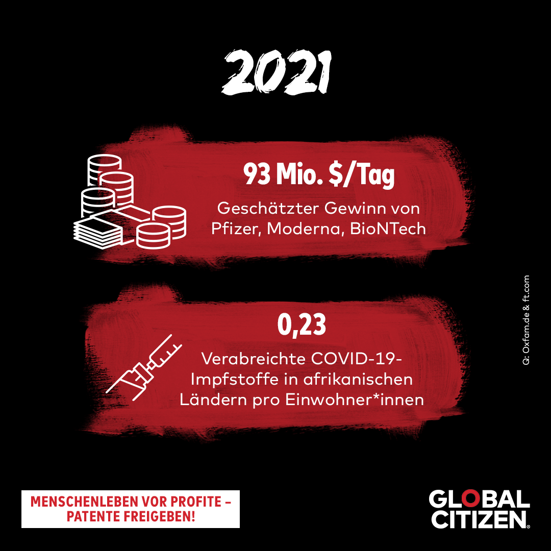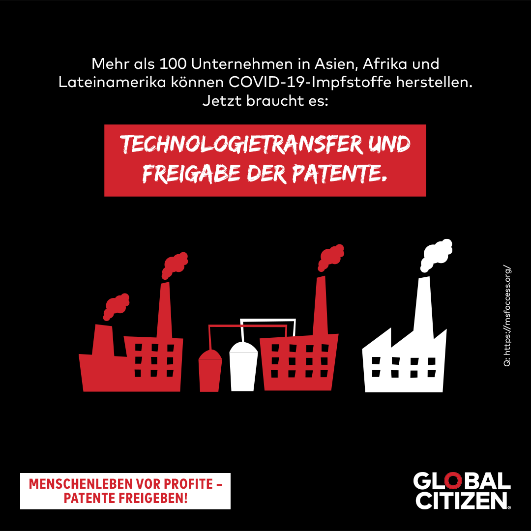 Wir können und wollen die heftige Ungerechtigkeit bei der globalen Impfstoffverteilung nicht weiter akzeptieren. Menschenleben gehören vor Profite und deswegen plädieren wir gemeinsam mit zivilgesellschaftlichen Organisationen weltweit dafür, dass die Patente für die Zeit der Pandemie freigegeben werden und das Wissen und die Technologien von den Pharmaunternehmen geteilt werden.