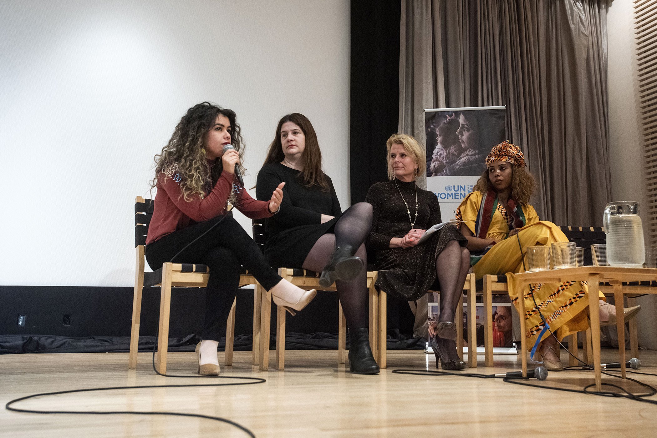 Aya Chebbi, African Union, Youth Envoy, moderates panelists during an event at the Scandinavia House on Friday, 15, March, 2019.