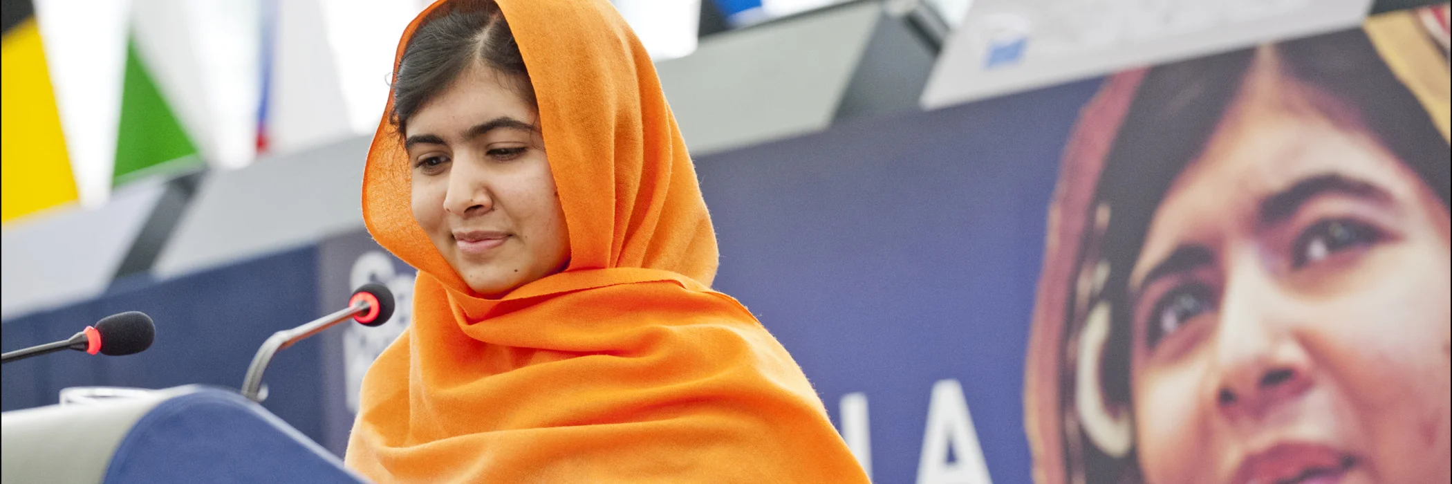 Malala Yousafzaï accepts the 2013 Sakharov Prize for Freedom of Thought for her activism promoting girls' education during a ceremony in Strasbourg.