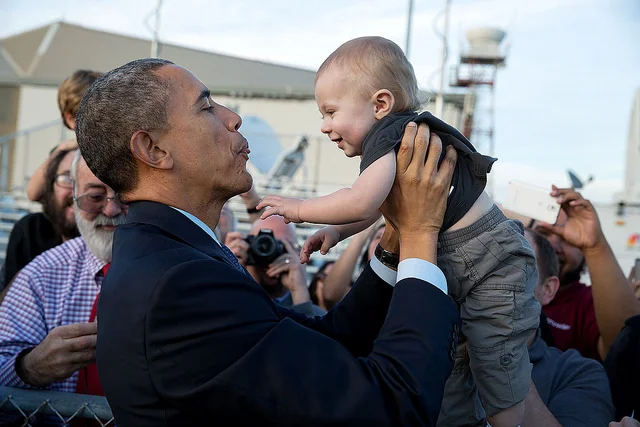 4) In this iconic photo, Obama lets a young boy, who recently had his hair buzzed, pat the president's head, "to see if it felt the same as his" in May 2008.