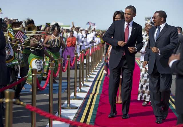 33) Obama was also prone to spontaneously dancing. Here he breaks into dance along with Tanzanian President Jakaya Kikwete upon arrival at the airport in Dar Es Salaam.