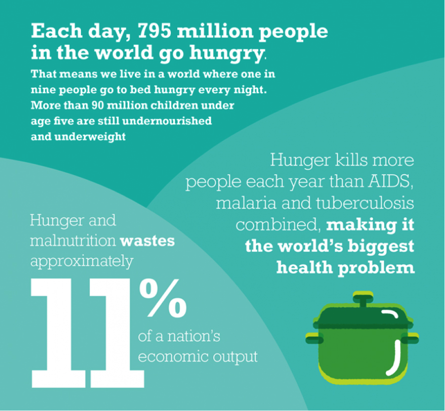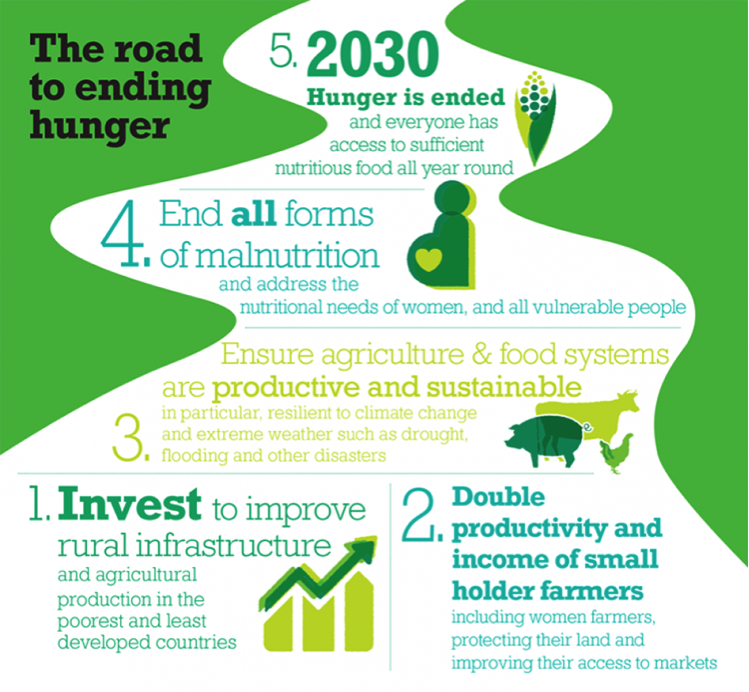 6. We believe that all of the sustainable development goals are important. However, the overall ambition to eradicate extreme poverty by 2030 will not be possible without ending hunger and malnutrition. Good nutrition is not only an outcome of development; it is also a driver of development and economic growth. Hunger and malnutrition wastes about 11% of a country’s economic output. Access to sufficient nutritious food is one of the foundations of sustainable development.