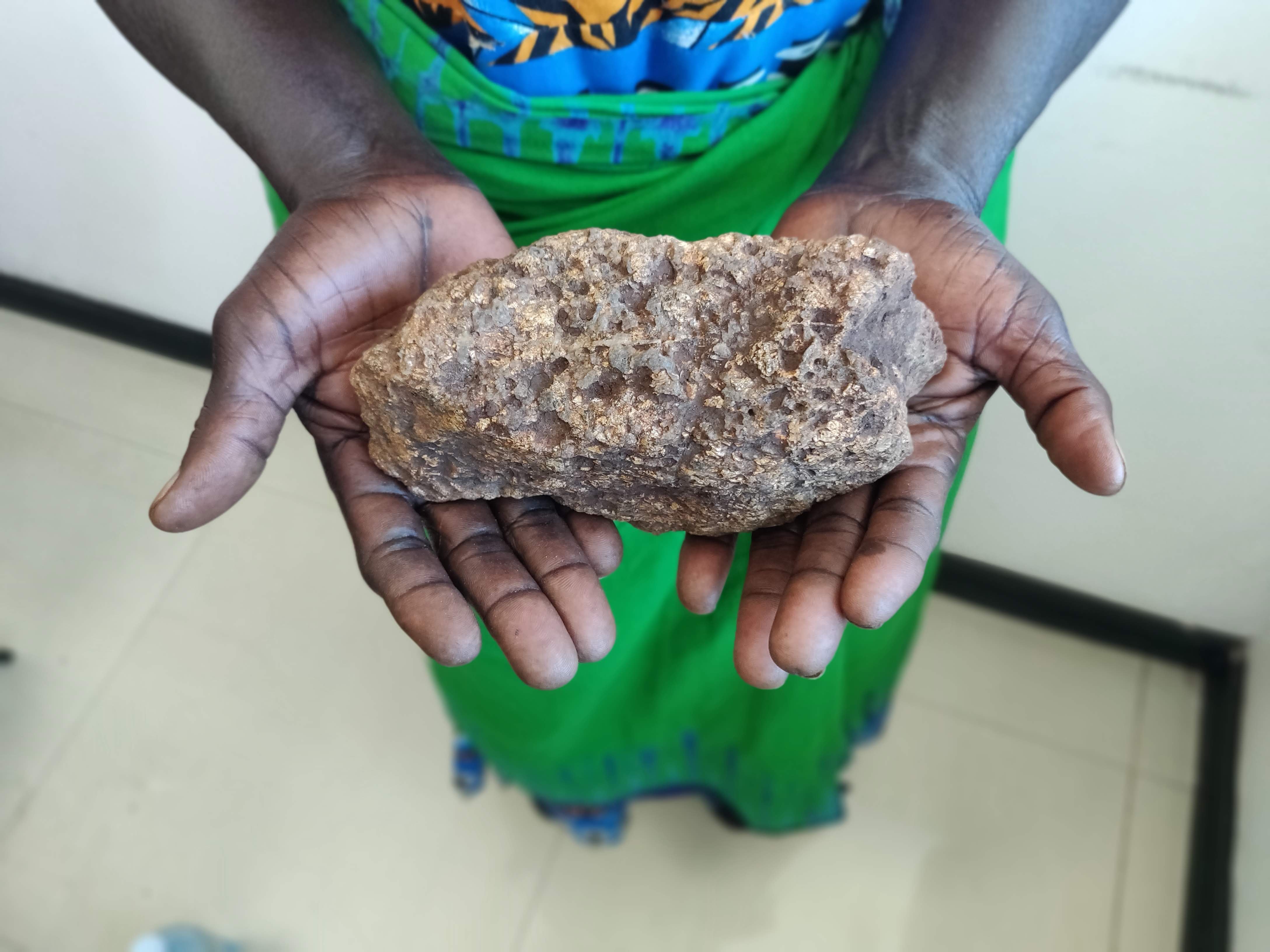 Betty Eyotau holds up a rock, drawing similarities between its scaly texture and a former skin condition she had. As she holds it between her hands, Eyotau draws attention to the bumps on the stone, which has dozens of small holes.