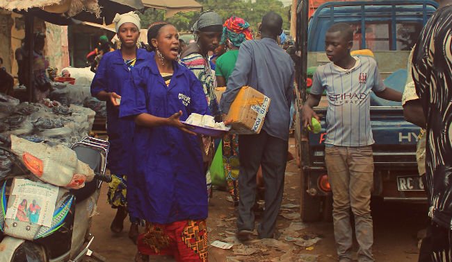 The women don‘t just sell, they inform, sparking conversations with elderly peanut paste sellers, young motorbike men, middle aged shop owners and women selling a few pieces of vegetables on the ground. They reach out to them on the importance of washing their hands to protect themselves against Ebola.