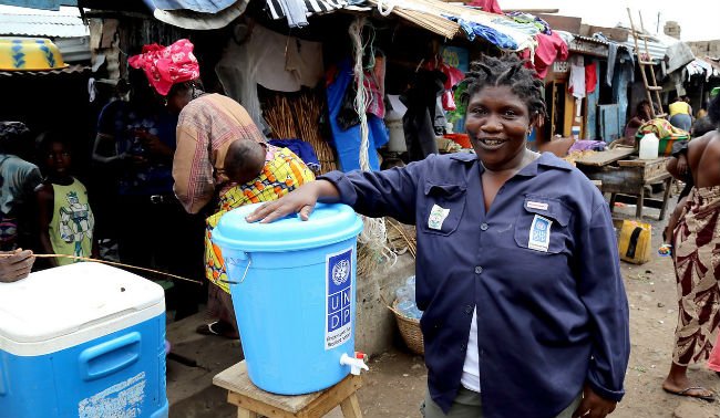 In Sierra Leone, we distributed 105 UNDP Solidarity Kits to kick-start the survivors’ return to a normal life. These kits contain food, household items and hygiene supplies to enable those discharged from treatment centres to start afresh, after returning to their homes to find all their possessions destroyed.