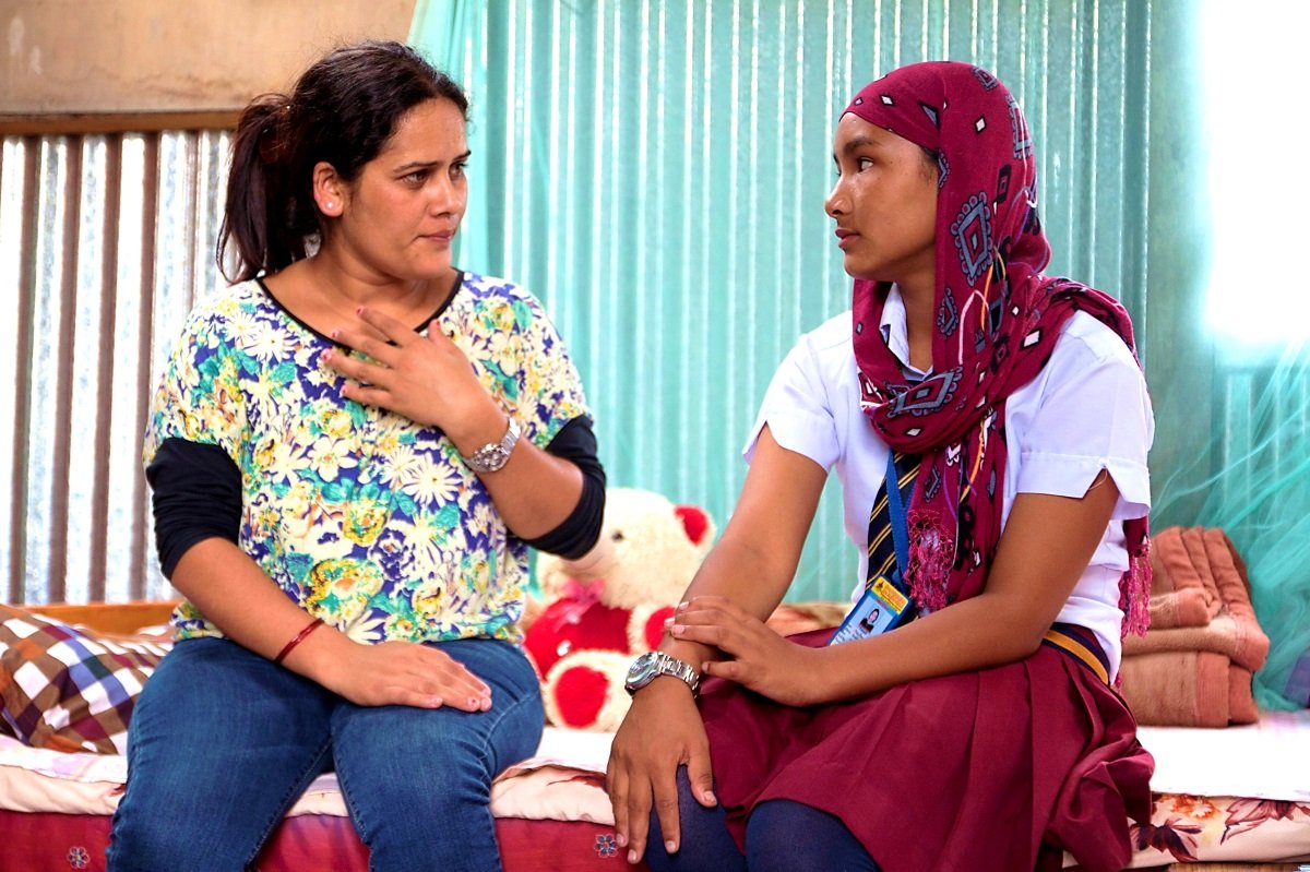 Room to Read Social Mobilizer Sumita counsels Pooja after the earthquake.