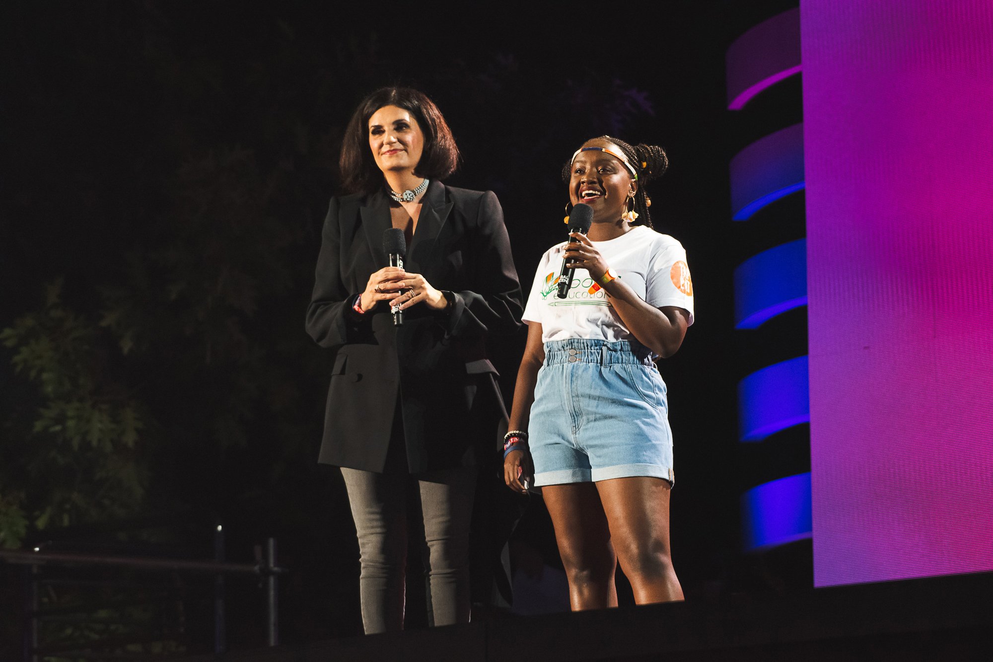 Cisco EVP and CPO Fran Katsoudas and Founder & Executive Director Youth Leadership & Food for Education Wawira Njiru speak onstage during the Global Citizen Festival in Central Park on September 28, 2019.