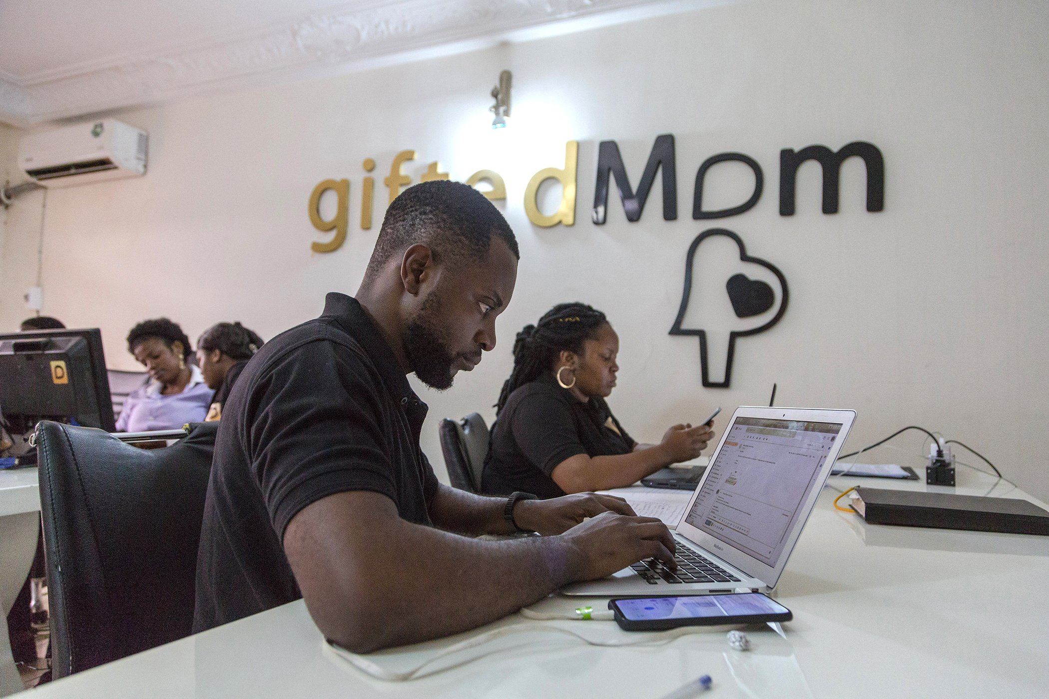 Alain Nteff works wit his team at the GiftedMom HQ in the Melen district of Yaoundé, Cameroon in . November 2019.