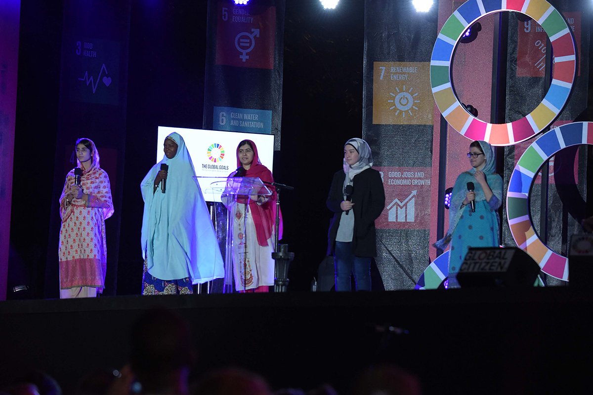 “I’m here standing with four other girls for a cause, for a basic human right — the right to go to school,” Malala said onstage.