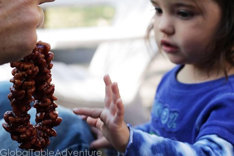 Georgians concentrate grapes around walnuts for a high-energy snack called Churchkella. My little girl was mesmerized by the looks of this natural edible necklace... strung together with fishing line, ready for power snacking on the go.
