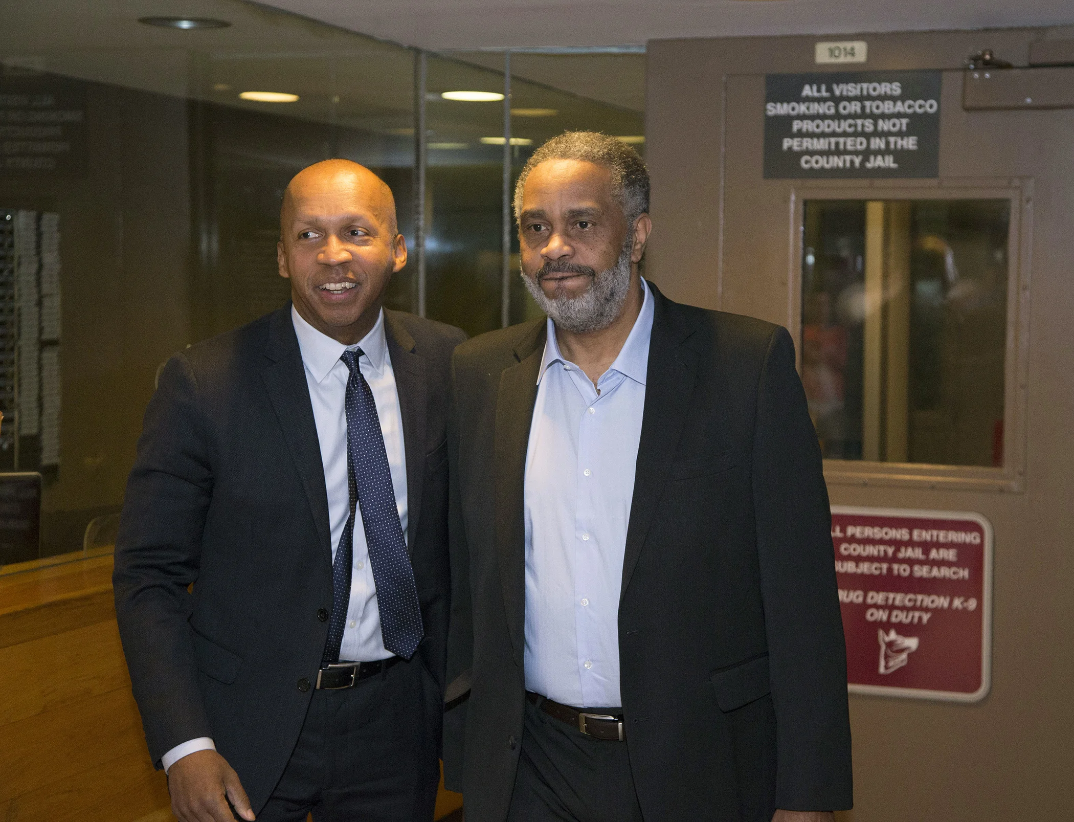 Bryan Stevenson, left, and Anthony Ray Hinton, right, on April 3, 2015, in Birmingham, Ala. After nearly 30 years on death row, Hinton was set free when prosecutors decided not to re-try him for the 1985 murders of two fast-food managers.