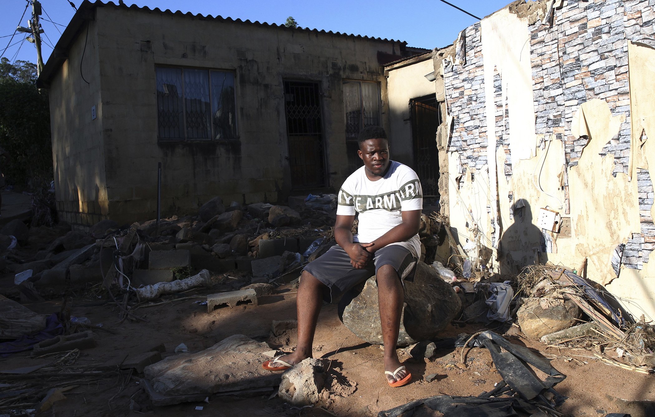 Khumbulani Radebe, a worker at a petrol station, sits on the rock after his house that was swept away by floods in Nhlungwane in Ntuzuma, near Durban, South Africa, April 19, 2022.