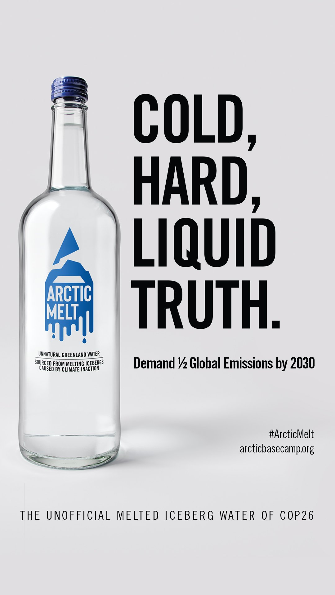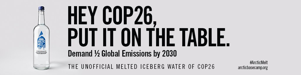 At COP26 in Glasgow, Arctic Basecamp handed out “Arctic Melt” bottles made from real melt water from Greenland. We wanted to put fresh, natural, unadulterated climate facts right under the noses of world leaders, COP26 delegates, climate deniers, and reporters in Glasgow. We brought the Arctic right into the heart of COP26 — “a single serving of alarming climate facts.” Each limited edition bottle contains messages of risk and the advice not to waste these precious glaciers. It was a literal “Bottled Warning” on the need to make bold and ambitious commitments on pledges for emissions reductions and climate action.