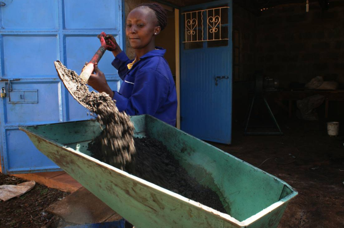 Muthoni then empties the container into a green compressing machine that turns out black briquettes, which can be burned for energy.