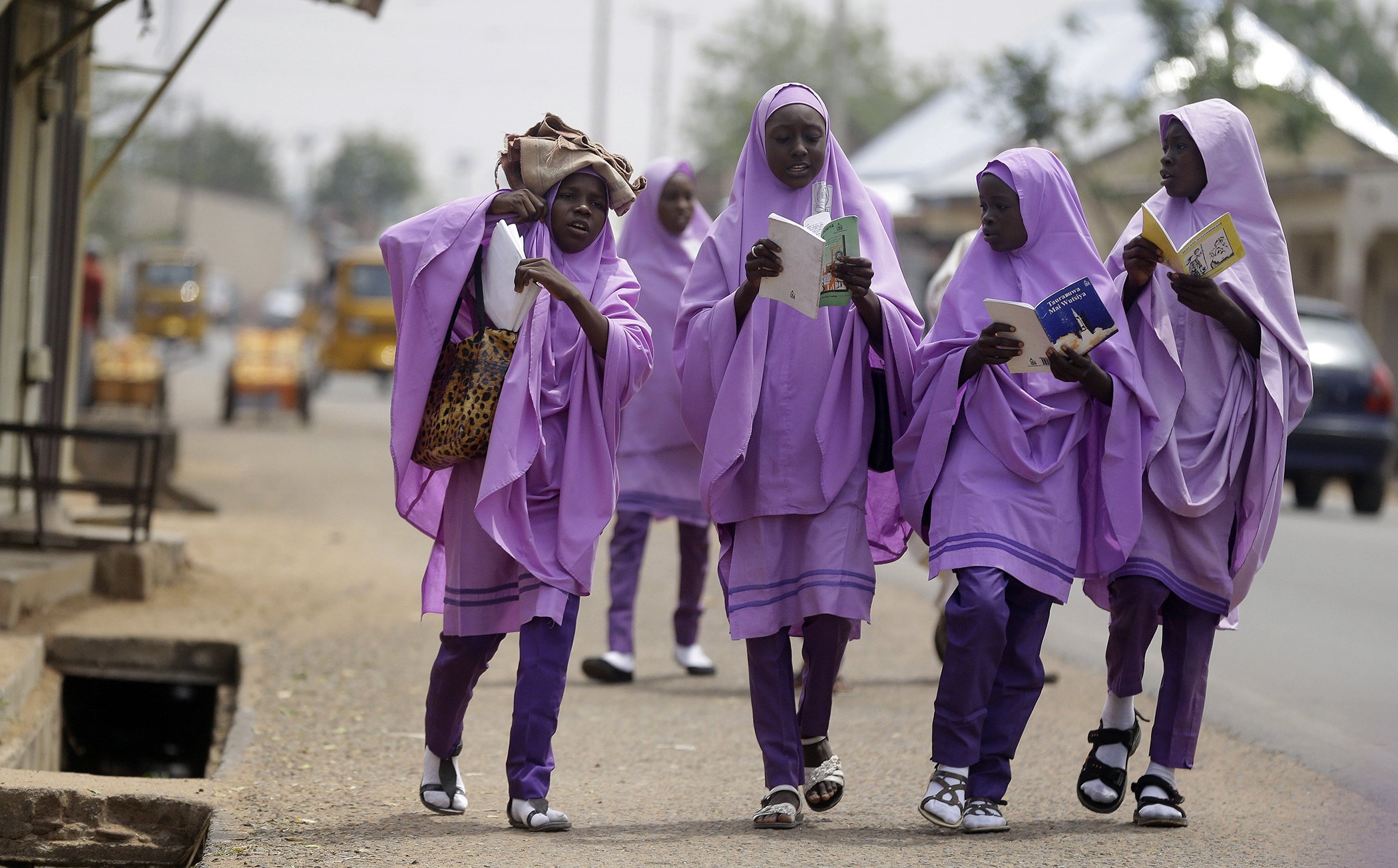 School girls walk on the streets in Yola, Nigeria, Feb. 25, 2019.
