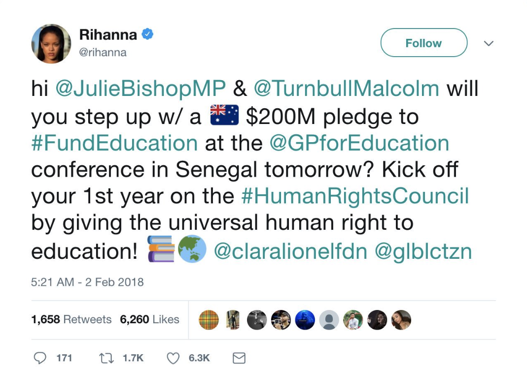 Rihanna and Global Citizens called on former Foreign Minister Julie Bishop and Prime Minister Malcolm Turnbull to invest in the Global Partnership for Education in an effort to help get an additional 870 million children in school. This resulted in AUD $90 million being committed.