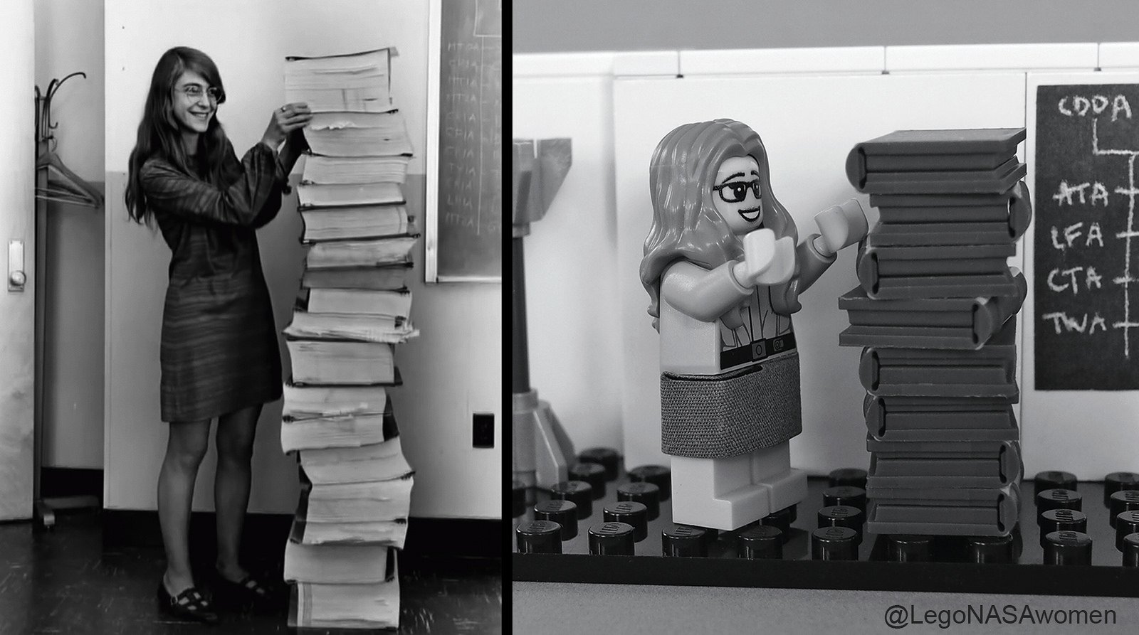 Hamilton is a completely badass computer scientist whose coding got man on the moon — and safely back again. This is her (left), posing next to an enormous pile of code that she hand wrote — and on the right is the Lego figure her great work inspired.
