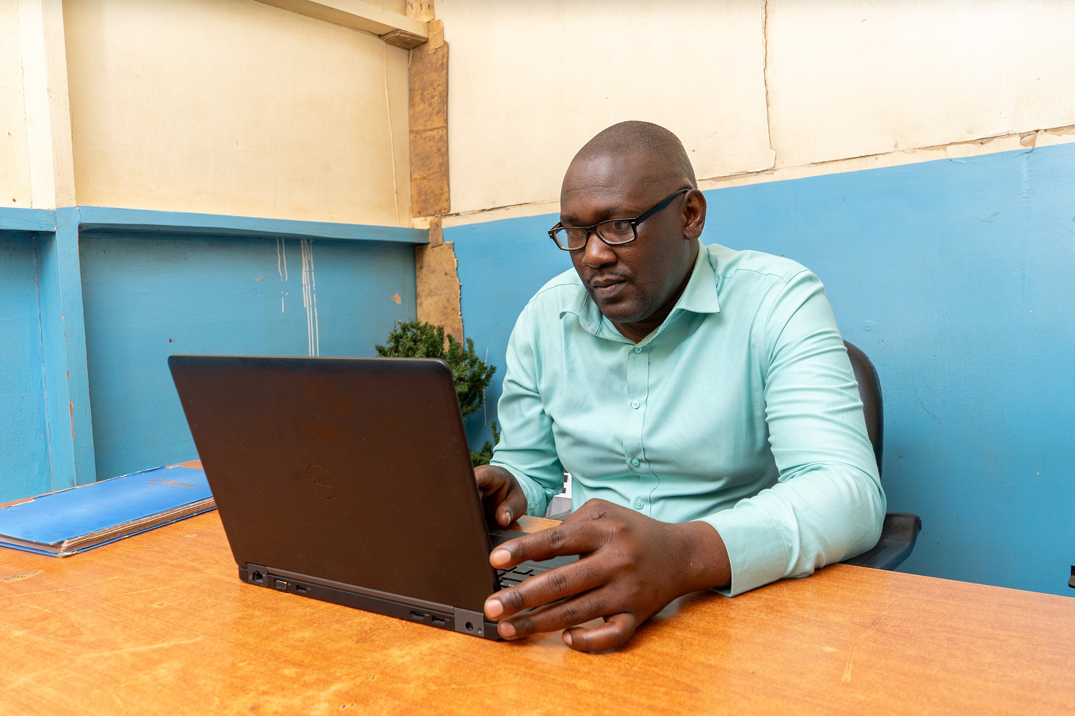 Benon Kabale works on his laptop in Kampala District, Uganda in March 2025. Kabale established MHRI, which runs a peer-to-peer support network, advocates for persons with disabilities, and works to fight stigma and increase acceptance.