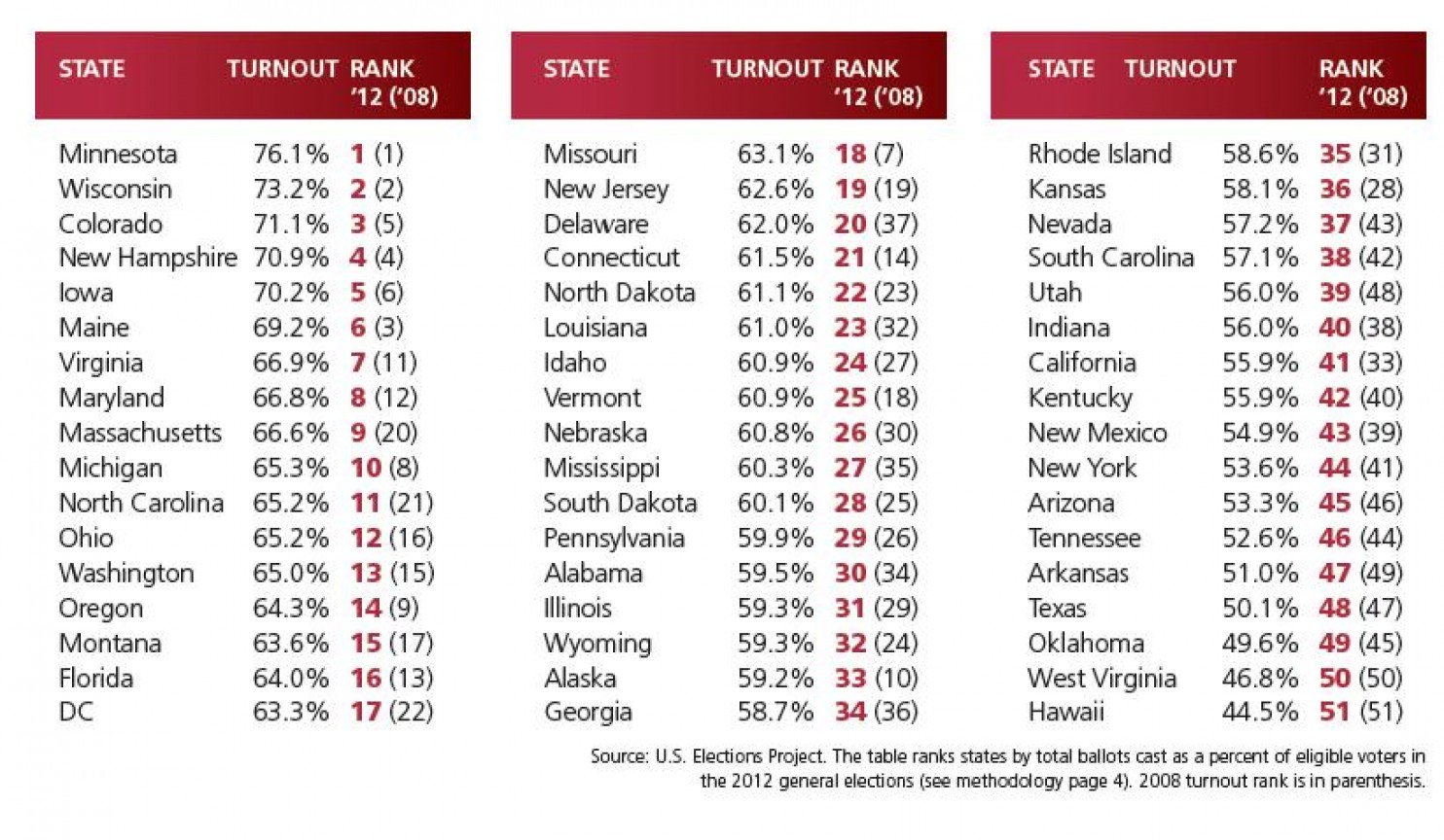 In 2012, 76% of Minnesotans voted in the 2012 presidential election. If state-by-state voting were a competition, Minnesota beats its nearest competitor — Wisconsin at 73% — by a solid three percentage-point margin.