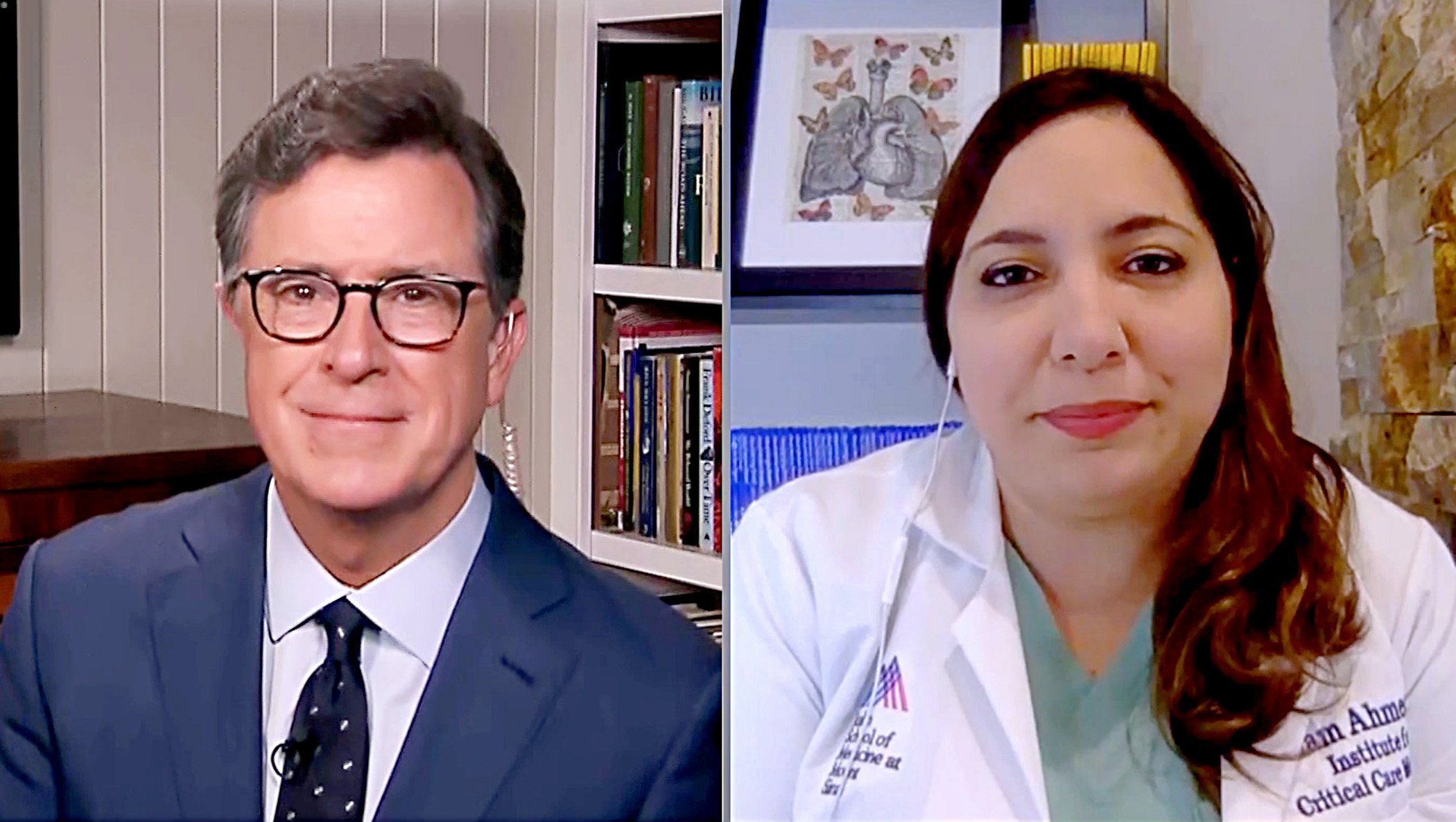 Late-night TV host Stephen Colbert, who hosted the television broadcast of One World Together At Home alongside Jimmy Fallon and Jimmy Kimmel, also introduced Dr. Sanam Ahmed, a critical care physician at Mount Sinai Hospital in New York.