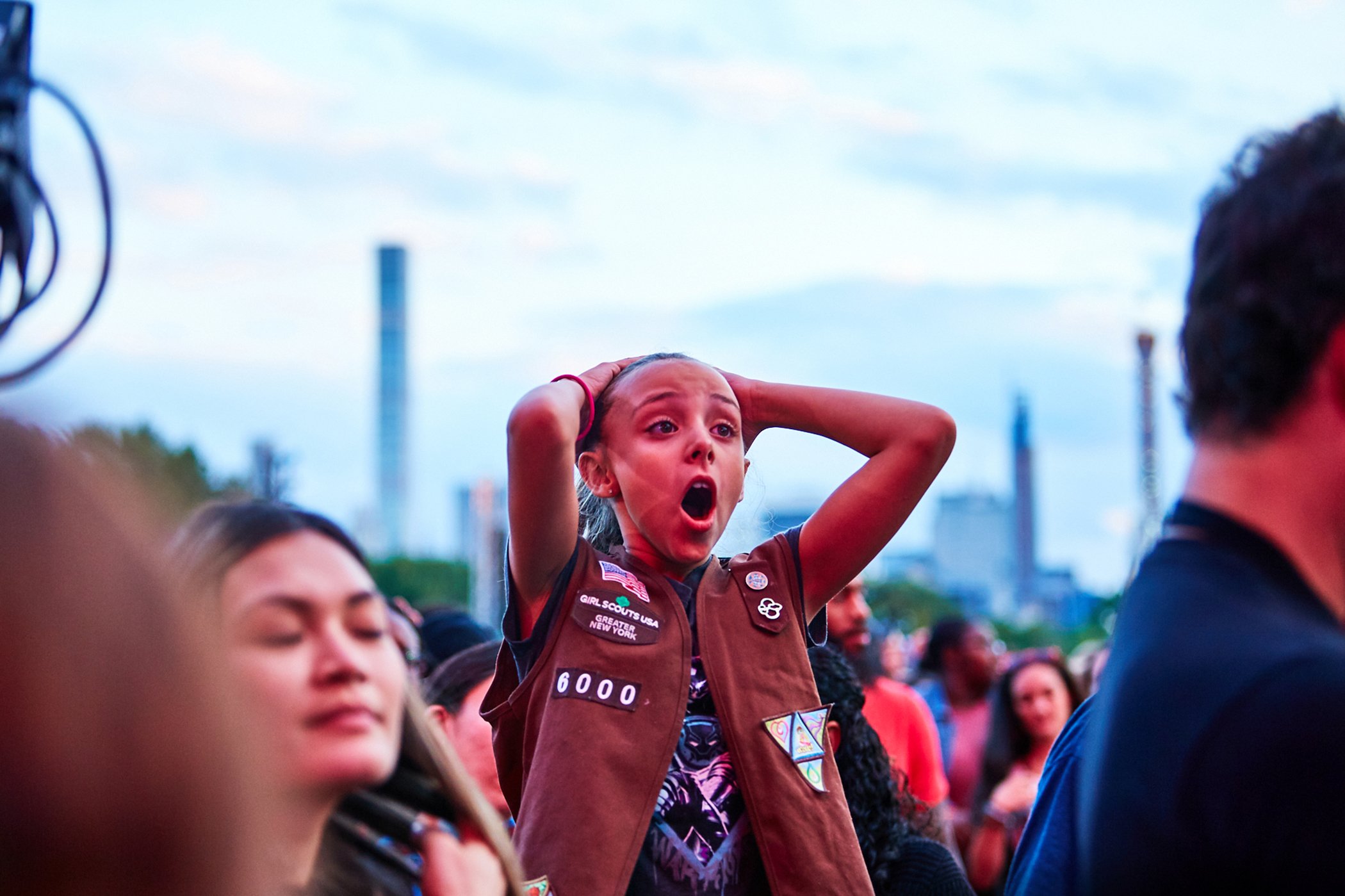 A little girl reacts to a performance at the Global Citizen Festival 2018 in Central Park on September 29, 2018 in New York City.