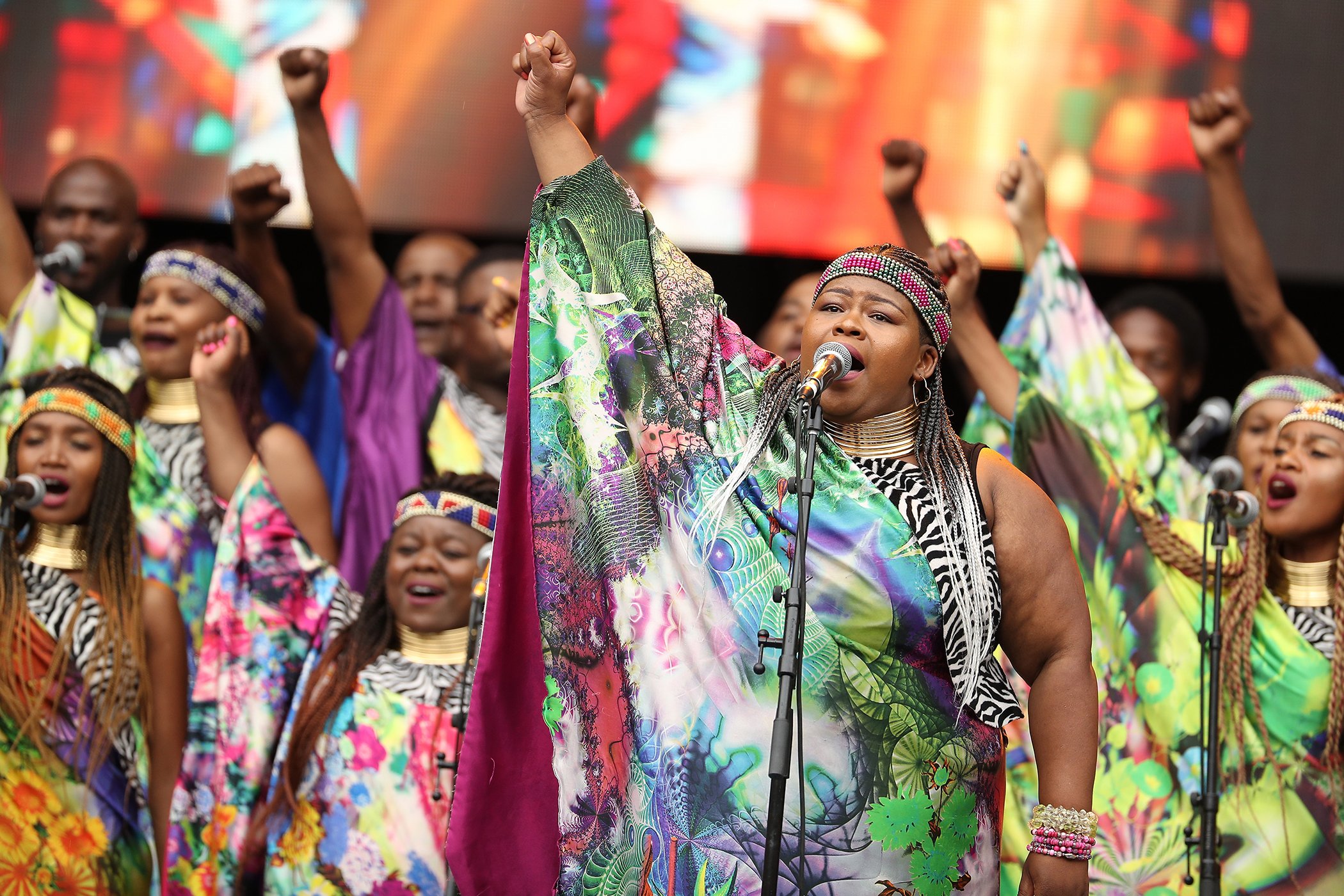 Soweto Gospel Choir perform during the Global Citizen Festival: Mandela 100 at FNB Stadium on December 2, 2018 in Johannesburg, South Africa.