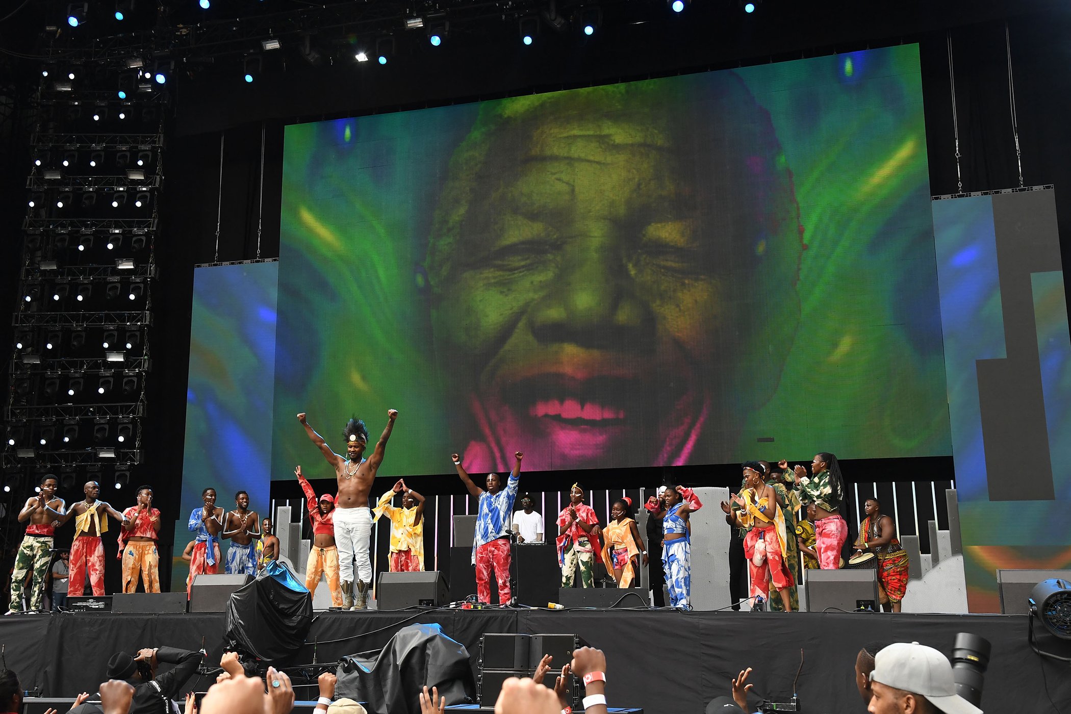 Zama Mandela (C) and other members of the Mandela family speak on stage during the Global Citizen Festival: Mandela 100 at FNB Stadium on December 2, 2018 in Johannesburg, South Africa.