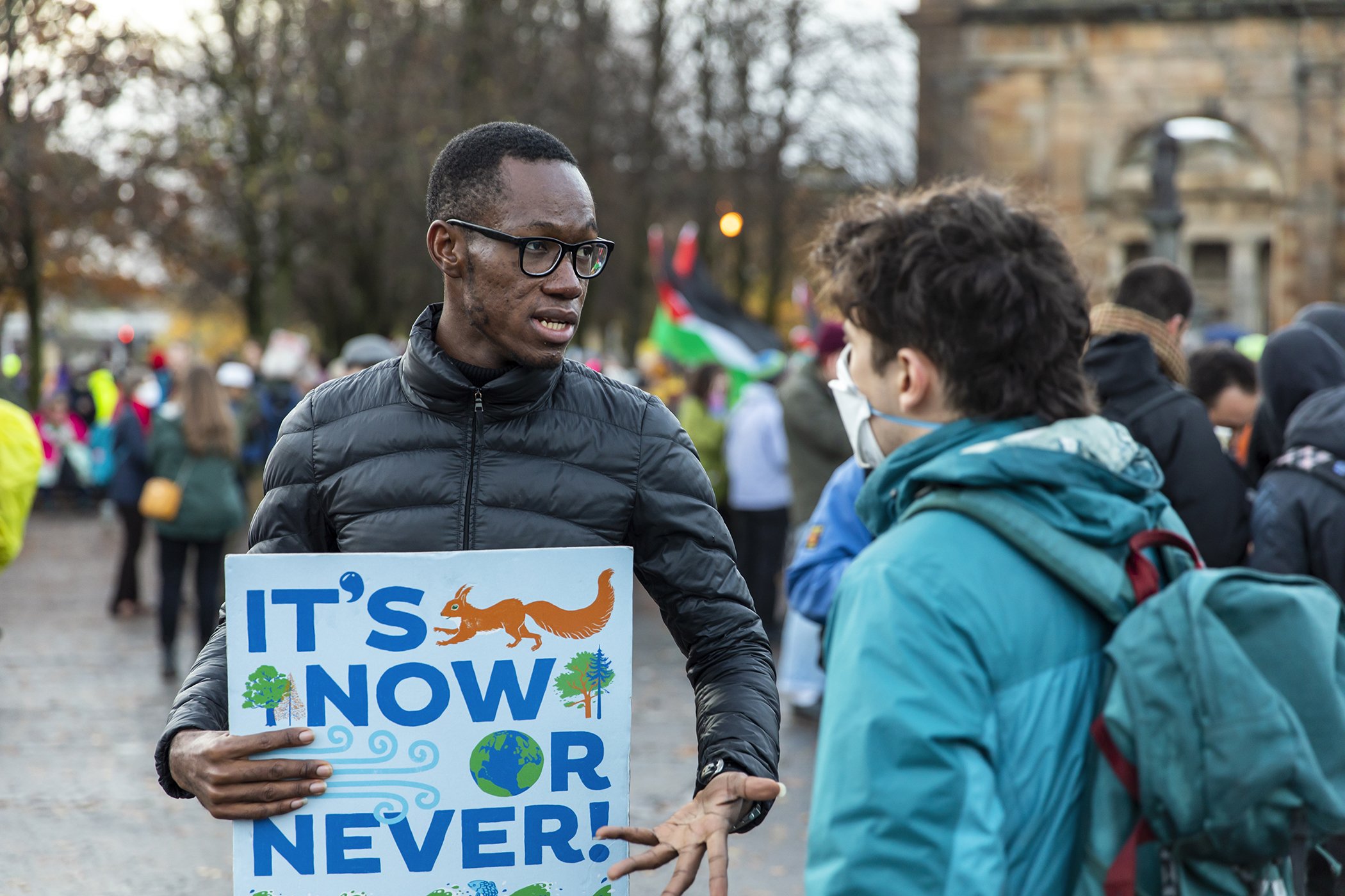 Azeez Abuakar speaks to fellow participants taking part in the Global Day of Action for Climate Justice in Glasgow, Scotland during COP26 on Nov. 6, 2021.