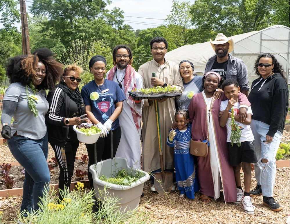 An image of Big Green's DAO Community members participating on volunteer day at Firdous Gardens in Atlanta, GA. April 2023.