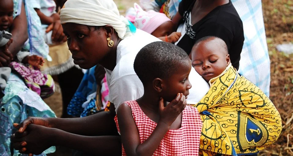 A mother attends a community meeting with her children. Babies are usually carried on the back, fastened securely with a piece of cloth. Her daughter wears a red and white checkered shirt, typical of a Nigerian school uniform.