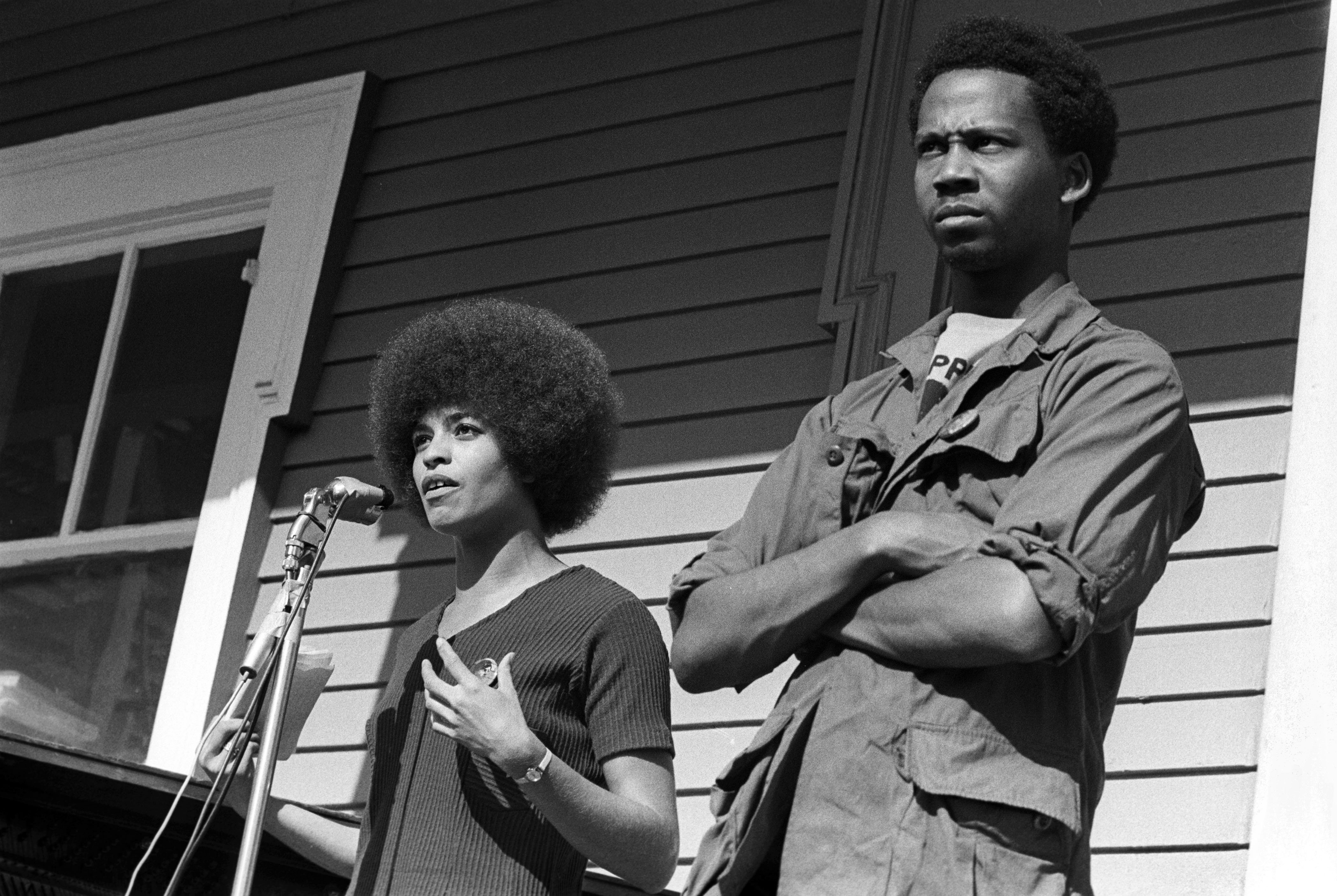 Angela Davis a former Black Panther Party member speaks at a Free Huey rally in DeFremery Park, Oakland, California, USA, on Wednesday Nov. 12, 1969, standing next to Angela is James Burford. |
