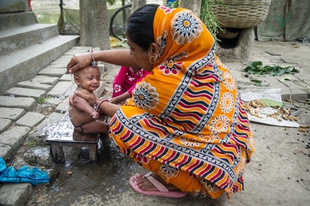 Back in West Bengal, about an hour’s drive from the Sarkars’ home, Majeda Bibi, 34, is bathing her six-month-old son under the outdoor water pump.
