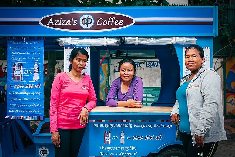 Before joining Aziza’s Place, Win Seun, 40, was a garbage picker in Phnom Penh who collected recyclables and sorted through a nearby dump site, only making $2 a day to support herself and her five children. However, since joining the coffee program, she’s learned valuable customer-service skills as well as how to speak English, how to operate the tuk-tuk, and even how to educate people about the benefits of recycling.