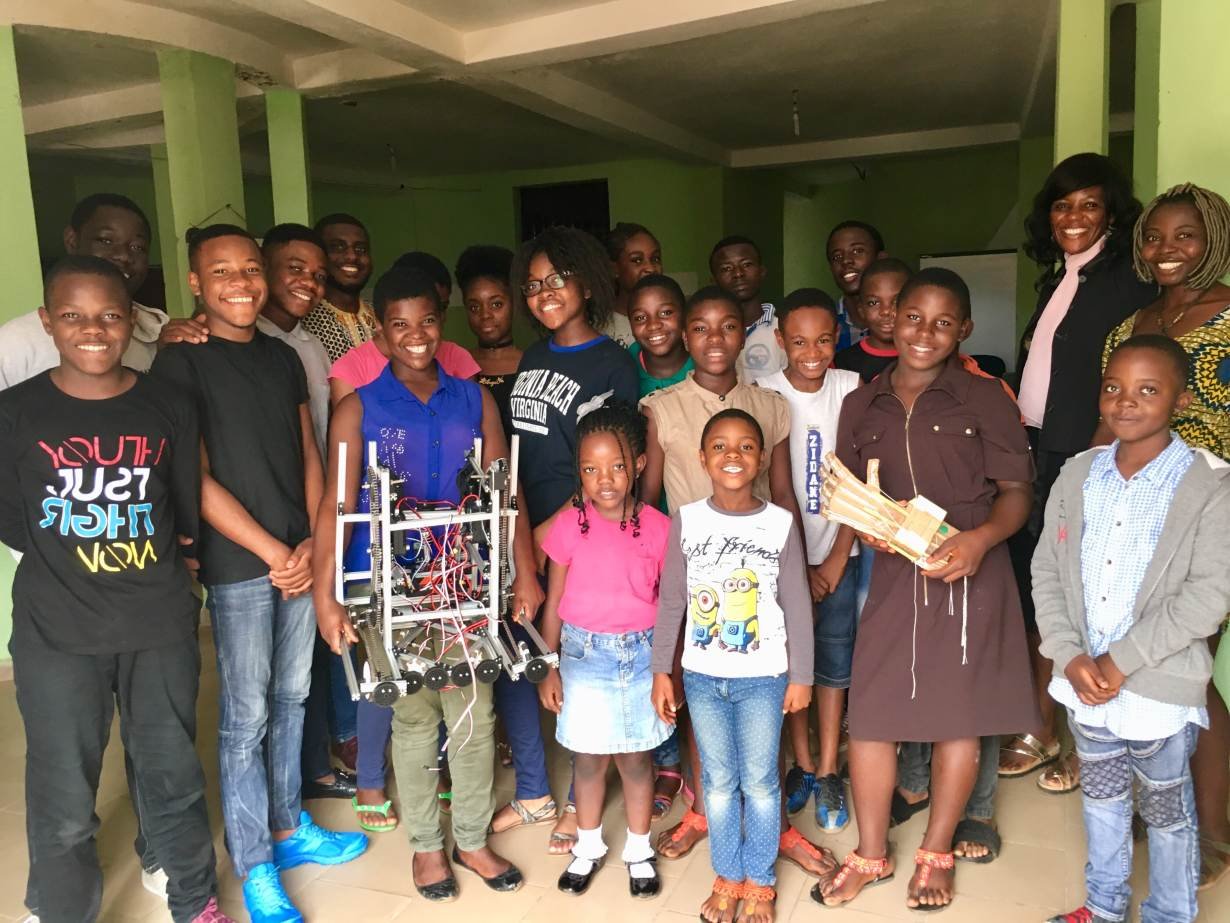 Janet Fofang and the children and youths taking part in NextGen technical skills workshop in Yaounde, Cameroon on July 11, 2018. Thomson Reuters Foundation / Inna Lazareva