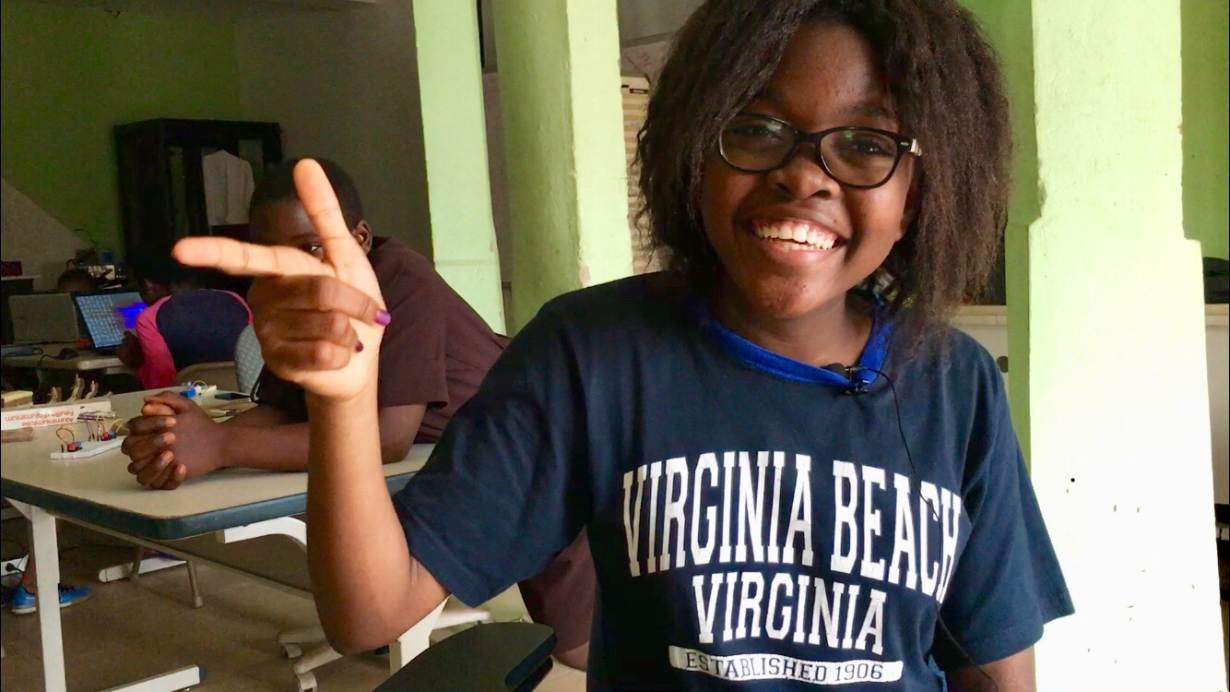 Xaviera Nguefo, 15, explaining why she likes robotics in the NextGen Centre, Yaounde, Cameroon on July 11, 2018. Thomson Reuters Foundation / Inna Lazareva
