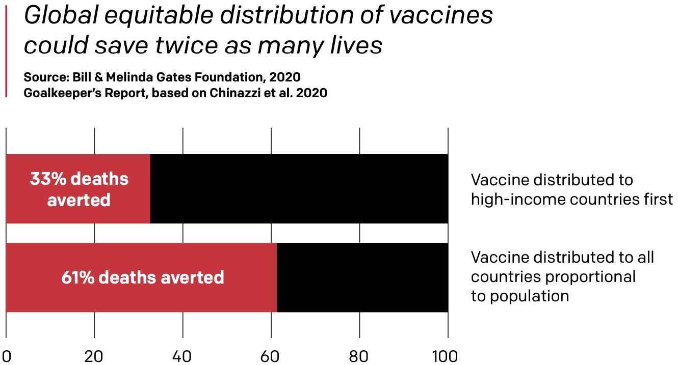 Most importantly, a truly global pandemic response will save more lives. If all countries receive the first 3 billion vaccine doses fairly in proportion to their populations, deaths could be reduced nearly twice as much compared to if the first vaccines are only available in rich countries.