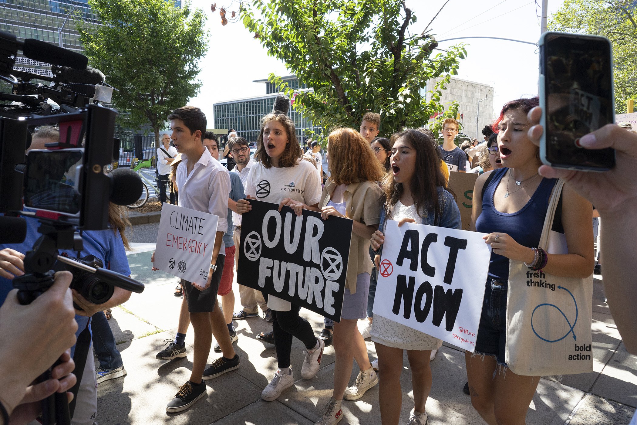 Youth climate activists take part in a demonstration calling for global action to combat climate change outside of United Nations Headquarters in New York City on Aug. 30, 2019.